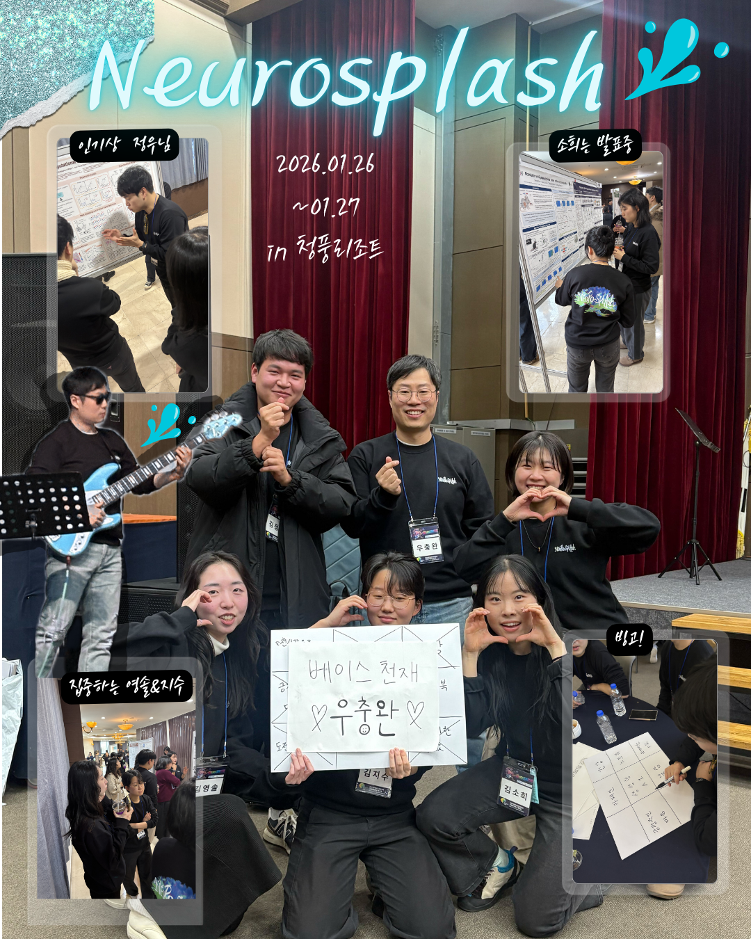 2026 neurosplash Neurosplash was an event where we got the best of both worlds: academic inspiration and lots of fun! We had a great time connecting with neuroscience labs across Korea. There were many interesting poster in poseter sessions and fun recreational activities. And of course, the highlight of the day might have been Wani’s amazing bass performance!